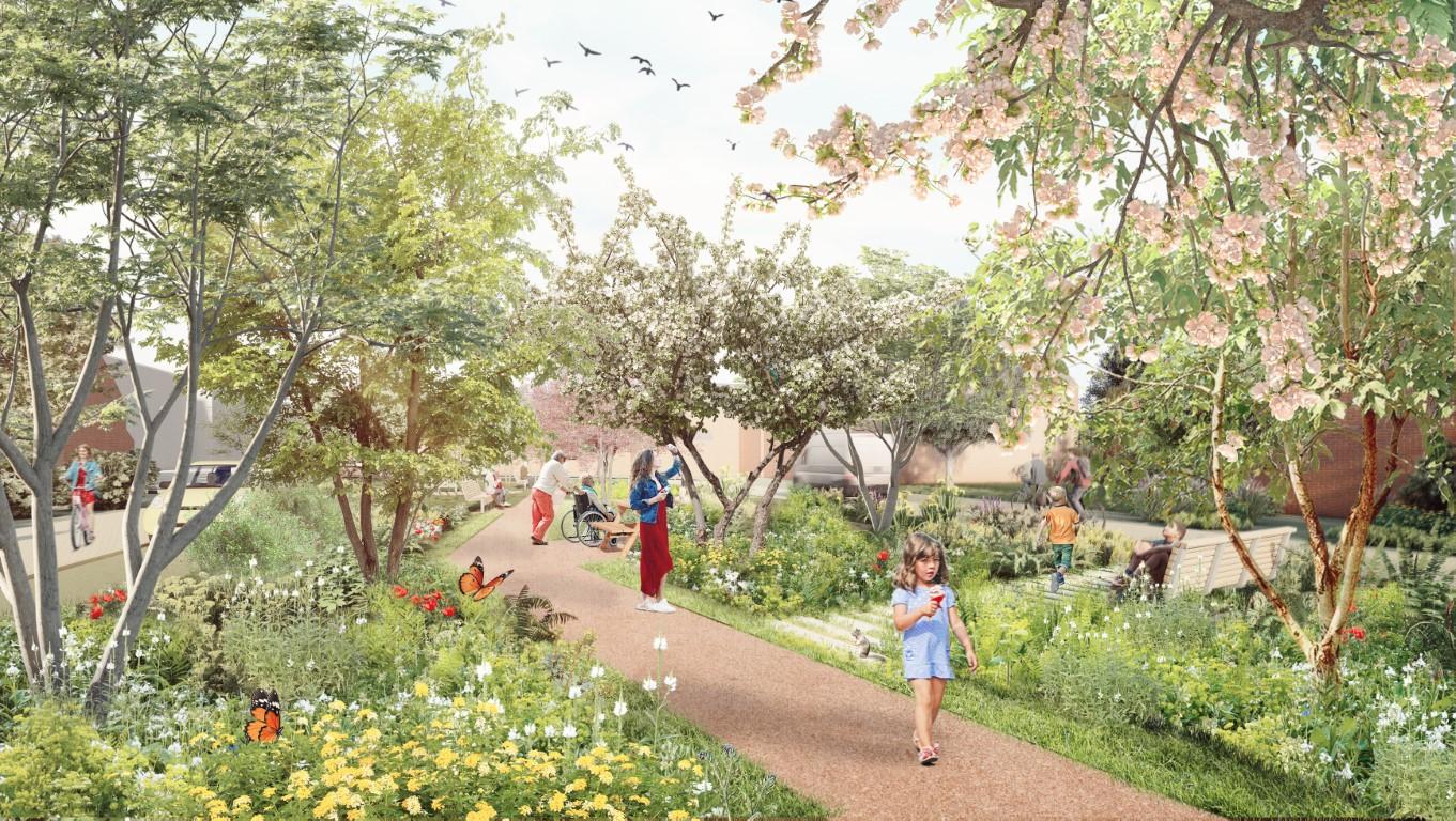 Voor de wandelpaden kiezen we halfverharding. Die ondergrond is waterdoorlatend én goed begaanbaar, ook met rolstoelen of buggy’s. Alle drempels naar de pleintjes verdwijnen.